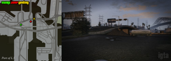 La PuertaYou will need speed for this jump. You have to clear not only the railroad, but two roads and land in the marina parking lot. Once you locate the jump from the screenshot, drive a ways back down the flood channel to where the burnt out vehicles are. Hit the jump at full speed aiming just slightly to the right.