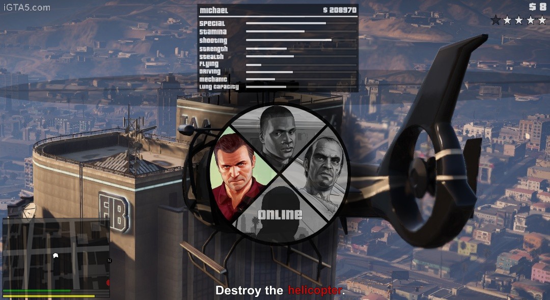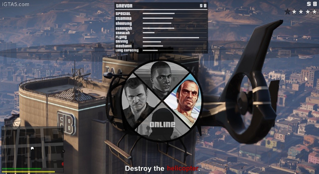 "...you ascend into the skies, Google Earth-style, the screen fills with static (although you can still see the outline of your location) and then you zoom across the city, zeroing in on the character of your choosing. The closer, geographically, Franklin, Trevor and Michael are to one another, the quicker the transition; when you're using all three in a mission, for example, the change will be instantaneous."