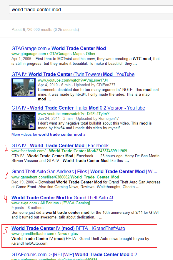 TreeFitty 2631 Report post Posted October 3, 2011 I added a few more "WTC" and "GTA IV" words in. Maybe we'll get higher. Share this post Link to post Share on other sites
