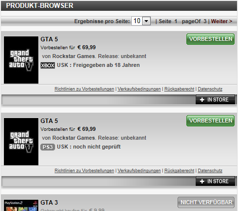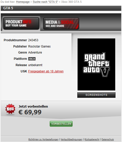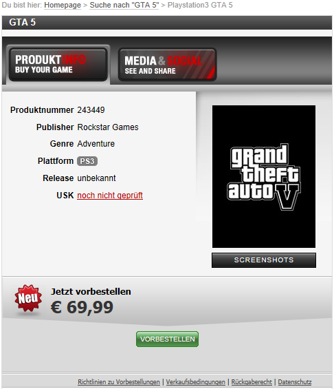 Back in April we reported that GameStop Germany had listed "GTA 5" on its website but took it down shortly after. They have now put it back up for the PlayStation 3 and Xbox 360. Last time it was listed with a January 15th, 2012 release date but this time it is listed as "unknown".