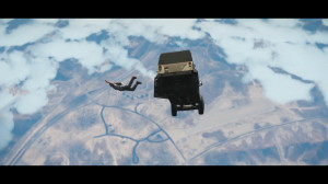 - A Jeep look-alike (Bodhi) rolls out of the back of a cargo plane (is this the C-130-type spotted in Max Payne 3 multiplayer?), Trevor jumps with a parachute