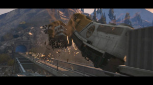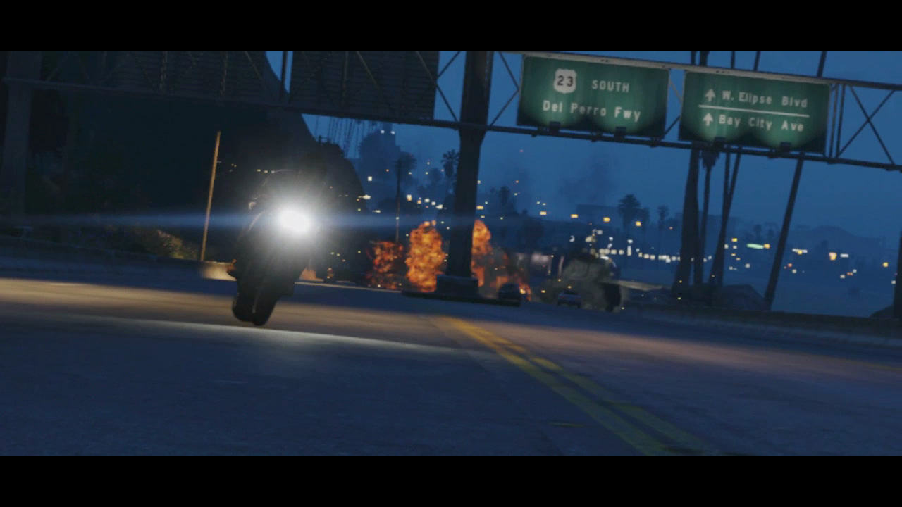 - Franklin speeds away from exploding cars along the Del Perro Freeway at night
