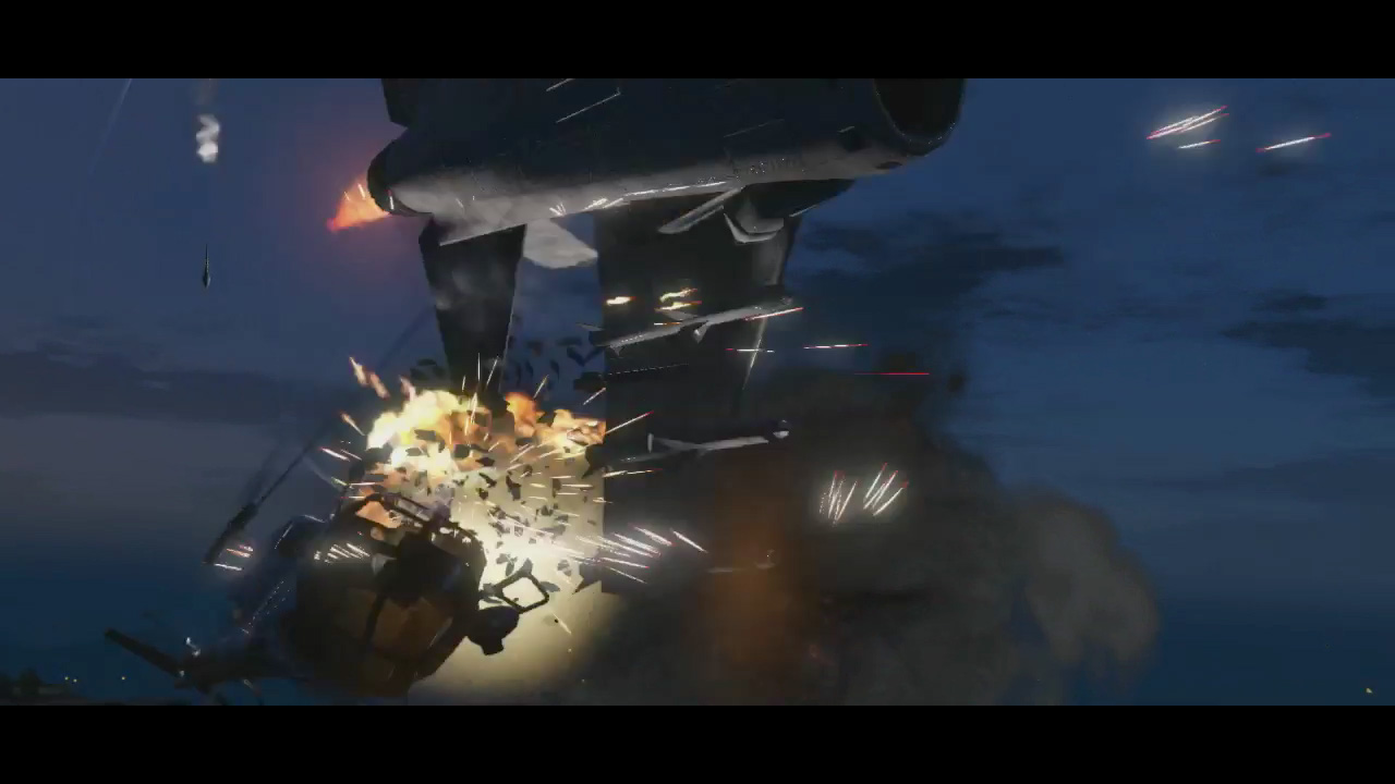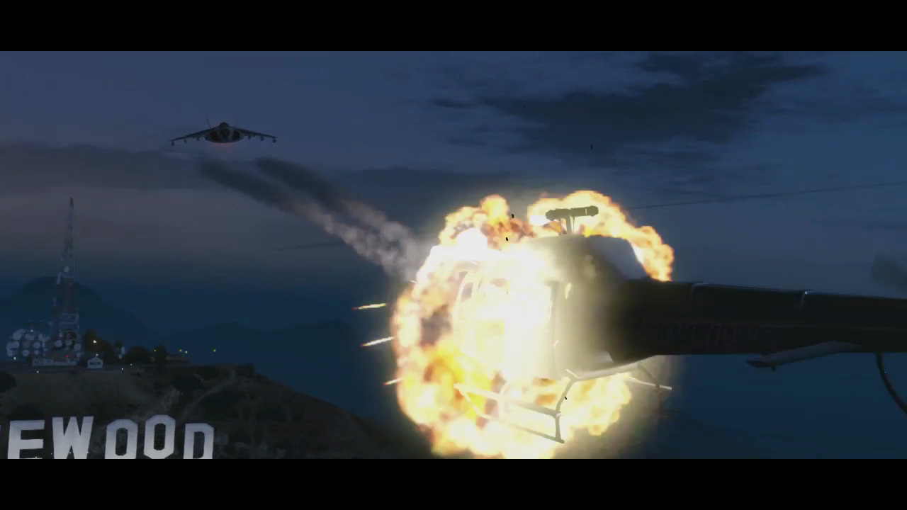 - Military jet (Hydra?) shoots missiles at a police helicopter