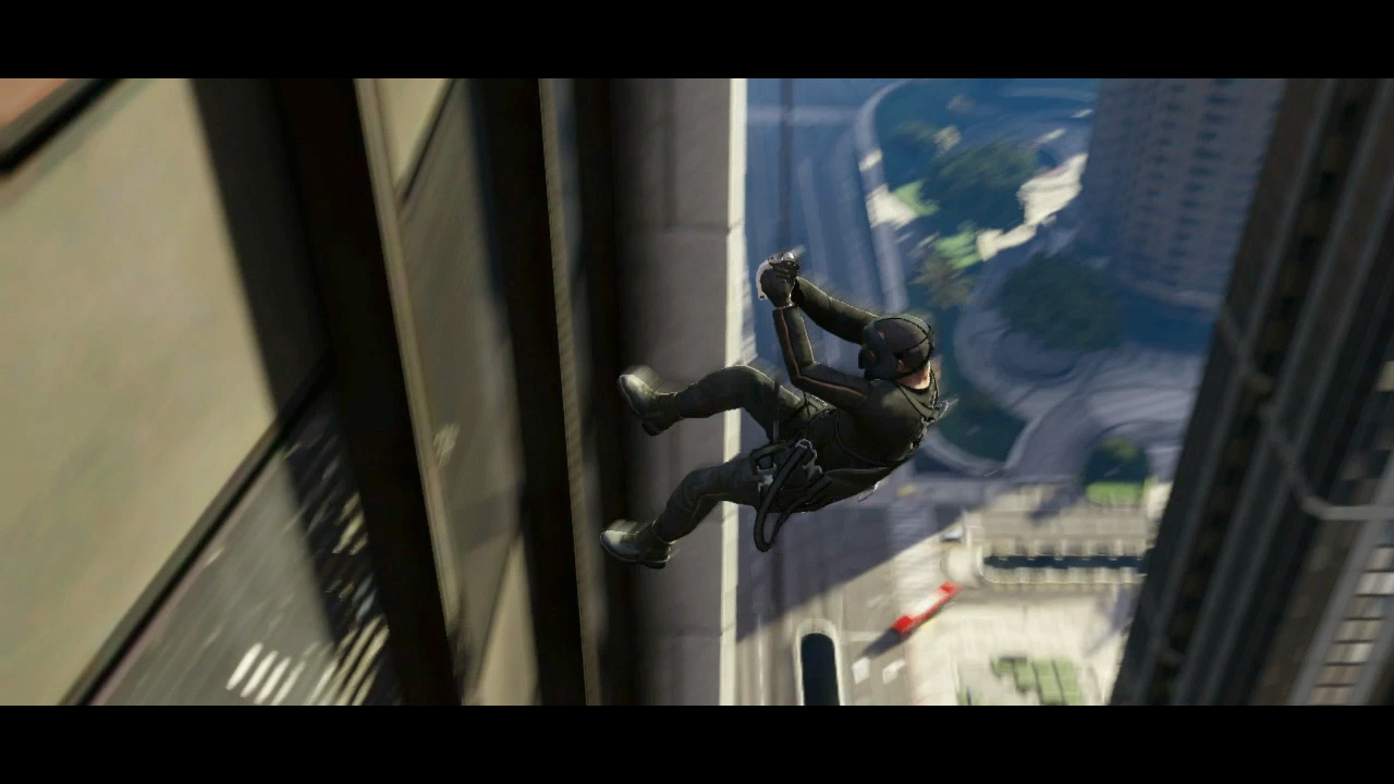 - Michael rappels down a building (IAA buidling, real life California Plaza) as shown in previews and screenshots