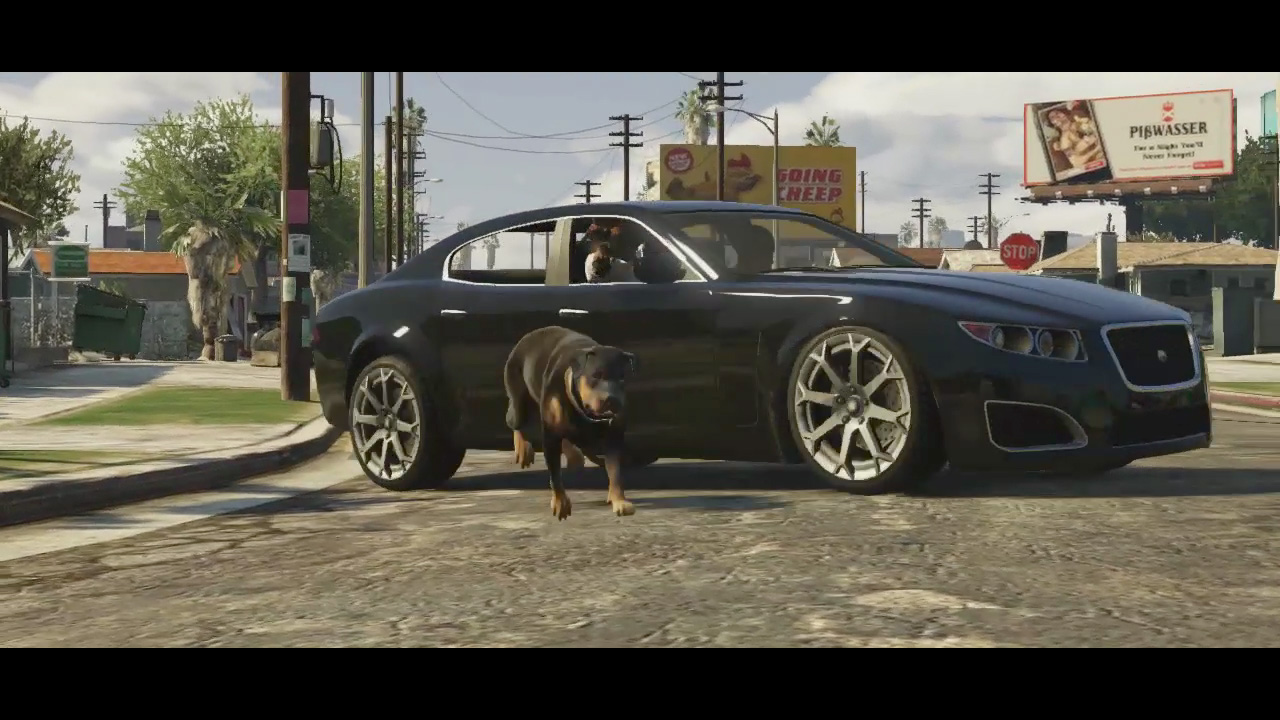 - A rottweiler runs past a black car (likely Chop as seen in Franklin's artwork) while two passengers shoot handguns from the car. There are at least three people in the car, possibly the protagonists.