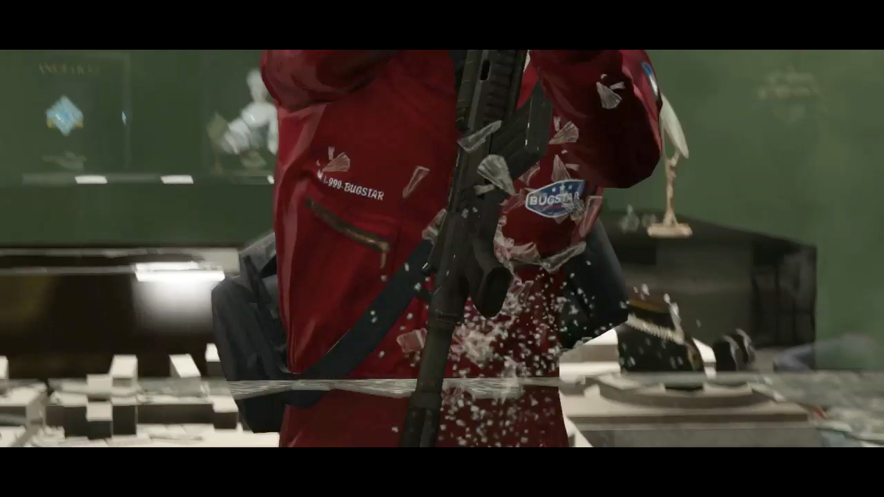 - A very quick shot of a glass case being broken into with the Bugstars uniform