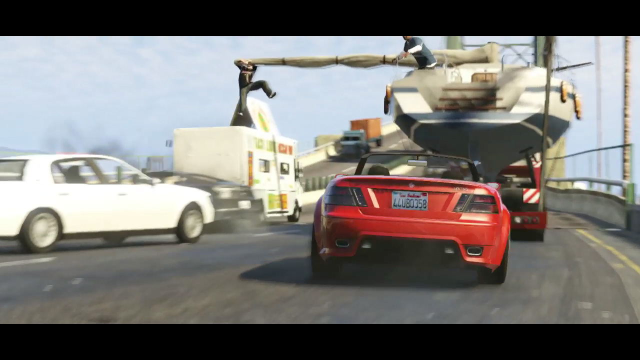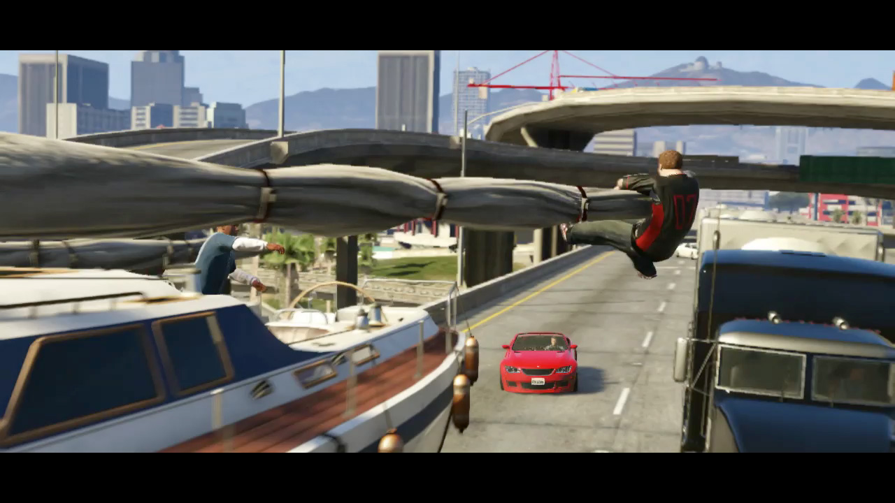 - A young white male holds onto a swaying sail boat boom being trucked along a freeway. Franklin is on the boat and Michael is driving a red car (confirmed Sentinel) behind them.