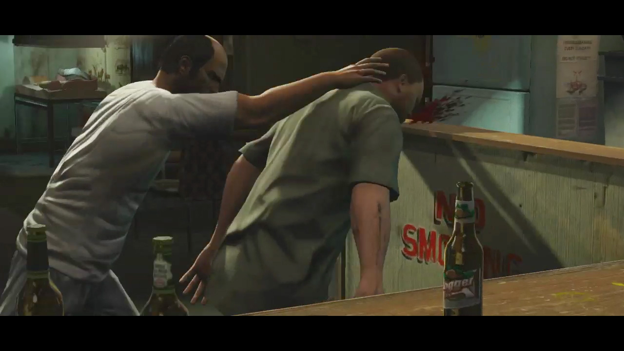 - Trevor grabs a man and slams his head against the bar, blood sprays