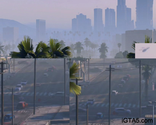 - Taller building on the left (right of the mountain) is possibly the real life Equitable Life Building in Koreatown which is known as Little Seoul in GTA V (see Scene 10).