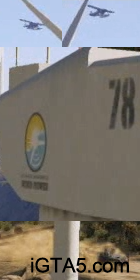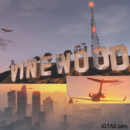 - Vinewood sign on hillside with airplane (Shamal?) flying over
