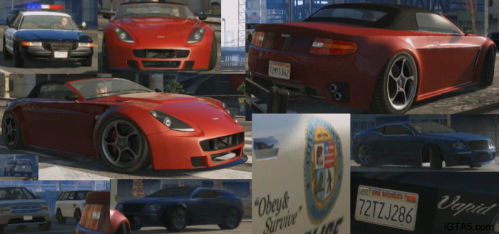 - Police car (Vapid Police Cruiser): "City of Los Santos, Police, Obey and Survive", San Andreas license plate, October expiration