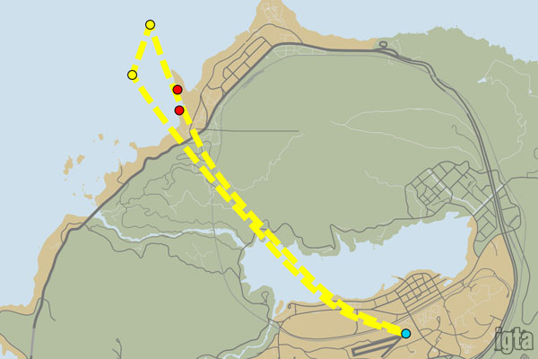 As Trevor, drive Franklin to the bridge. He'll give Franklin a sniper with a thermal scope. They'll talk about Merryweather along the way. When you reach the marker in the median you'll SWITCH to Franklin. Go to the vantage point and he'll call Michael who is in a Dinghy next to the ship. He can't see if any guards are on deck so Franklin needs to clear it. Snipe the two guards talking to each other on the bow. Michael will climb up and you are SWITCHed to him. Place a charge at the locations given on the ship.