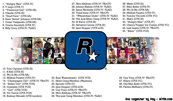 If, like me, you were playing GTA trivia with the 49 icons on the Rockstar North banner, here are the answers: