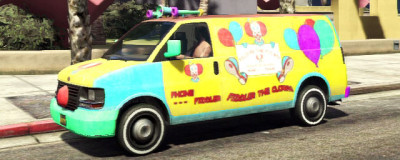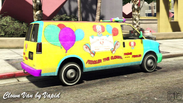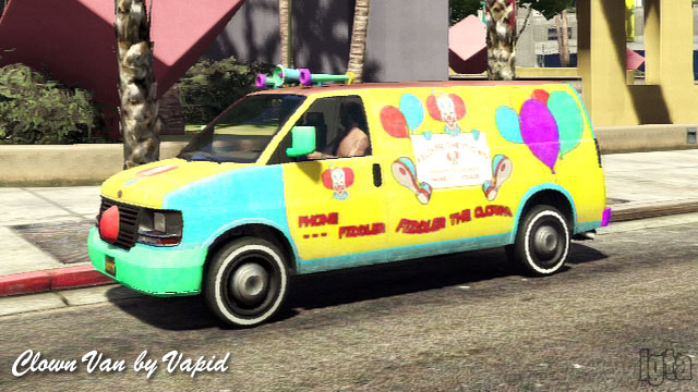 Clown Van by VapidInfluences: GM vansCapacity: 4 (or much more for clowns) Features: Colorful paint job with red nose and funny noises including the horn Notes: Modified Speedo. Featured in Grass Roots - Trevor (not operable) or GTA Online races if available. |
