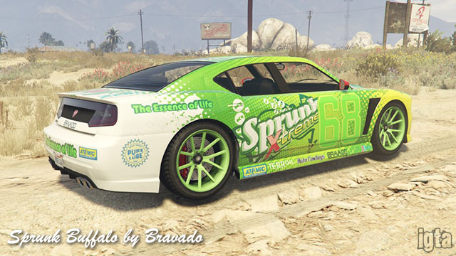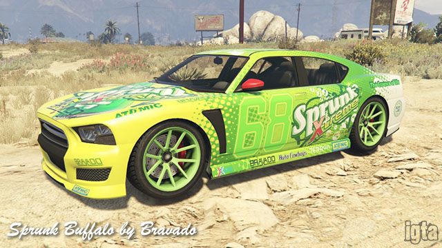 Sprunk Buffalo (S) by BravadoInfluences: Dodge ChargerCapacity: 4 Features: Notes: Franklin's variant-based. PC/PS4/XB1 returning players. Available after completing stock car races. GTAO from Cunning Stunts. |