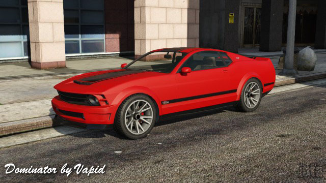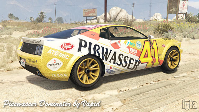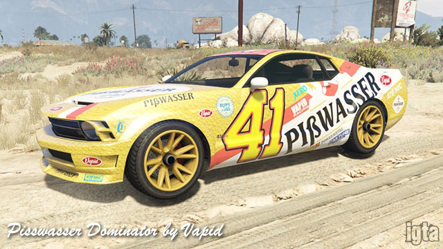Pisswasser Dominator by VapidInfluences: Ford MustangCapacity: 2 Features: Notes: PC/PS4/XB1 returning players. Available after completing stock car races. Available in GTAO from Cunning Stunts. |