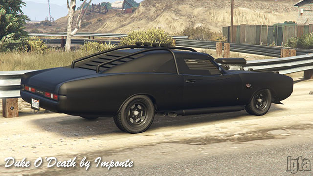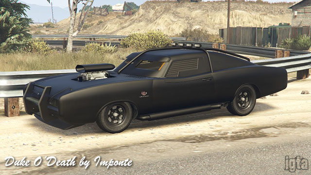 Duke O'Death by ImponteInfluences: Pontiac LeMans, Dodge Charger/ChallengerCapacity: 2 Features: Armor and other modifications Notes: PC/PS4/XB1 returning players. Available from the cafe on Route 68. Watch your back though... |
