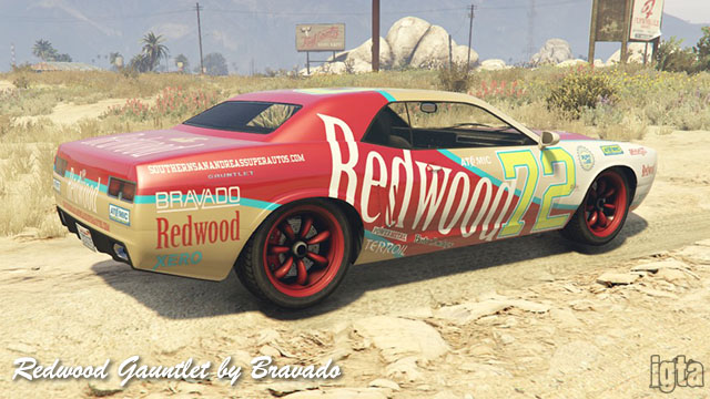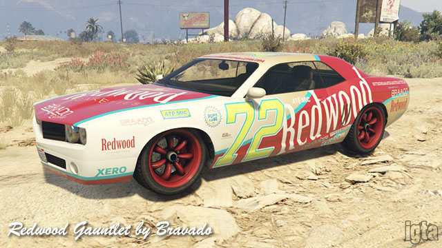 Redwood Gauntlet by BravadoInfluences: Dodge Challenger, Chevy CamaroCapacity: 2 Features: Notes: PC/PS4/Xb1 returning players. Available after completing stock car races. Available in GTAO from Cunning Stunts. |