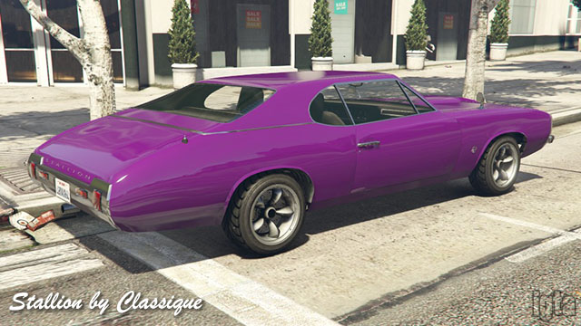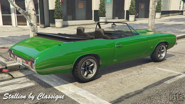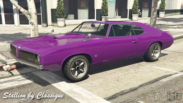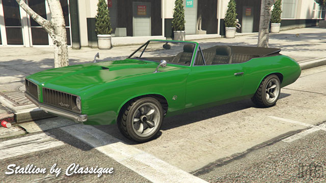 Stallion by ClassiqueInfluences: Oldsmobile CutlassCapacity: 2 Features: Notes: Rockstar lists it as Declasse but Classique logos are seen. Hard or open top variants. PC/PS4/Xb1. Also see Burger Shot variant above. |