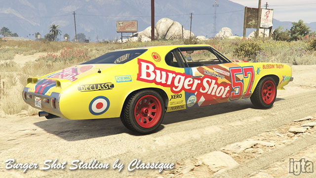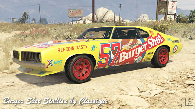 Burger Shot Stallion by ClassiqueInfluences: Oldsmobile CutlassCapacity: 2 Features: Notes: Rockstar lists it as Declasse but Classique logos are seen. PC/PS4/Xb1 returning players. Available after completing stock car races. Available in GTAO from Cunning Stunts. |